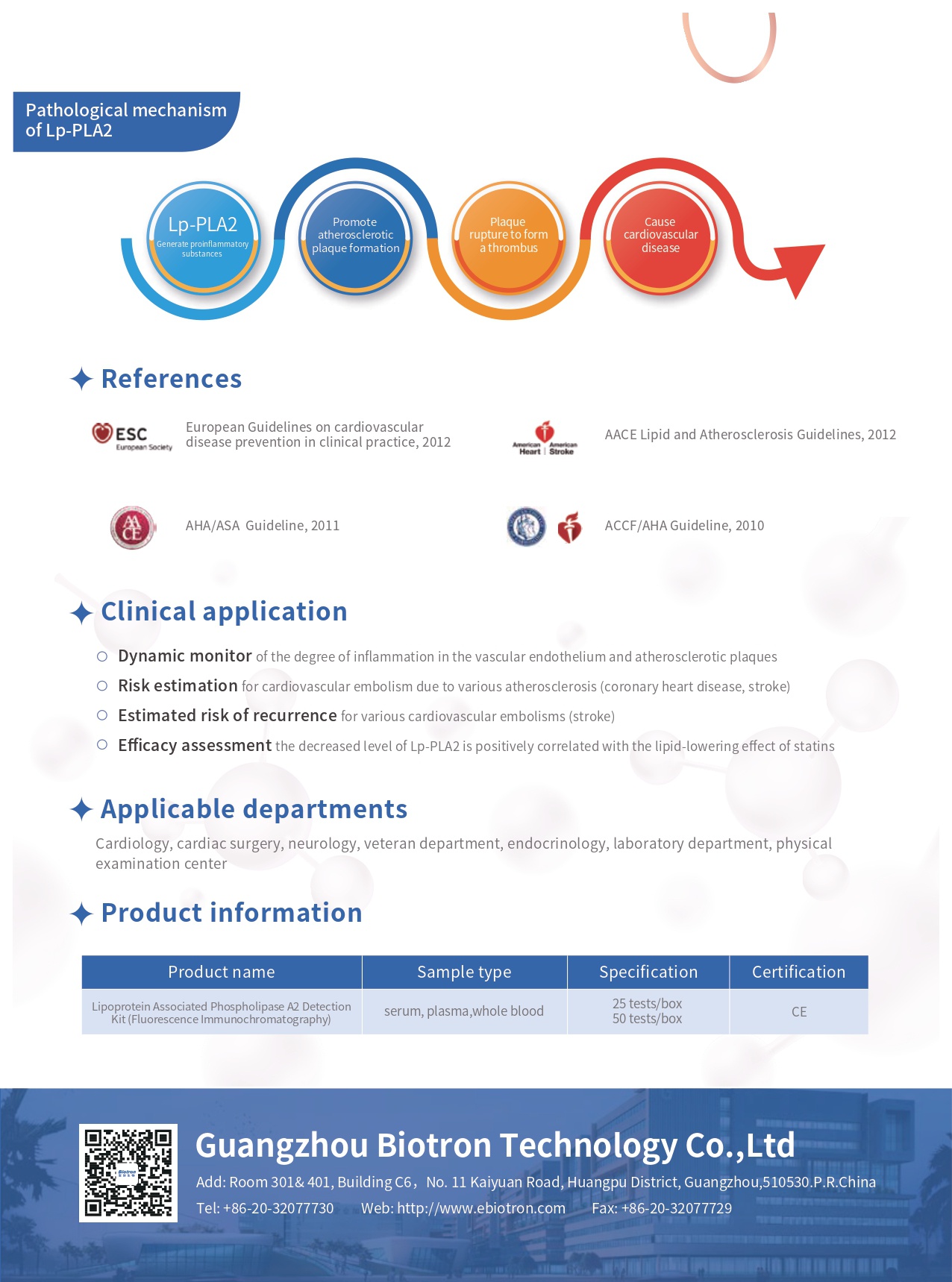 The international recognition and importance of Lp-PLA2 is gradually increasing, and it is recommended that Lp-PLA2 be used in various aspects of cardiovascular and cerebrovascular diseases such as screening, differential diagnosis, risk assessment, treatment and prognosis.Guideline Recommendation Table is shown in Figure 2.