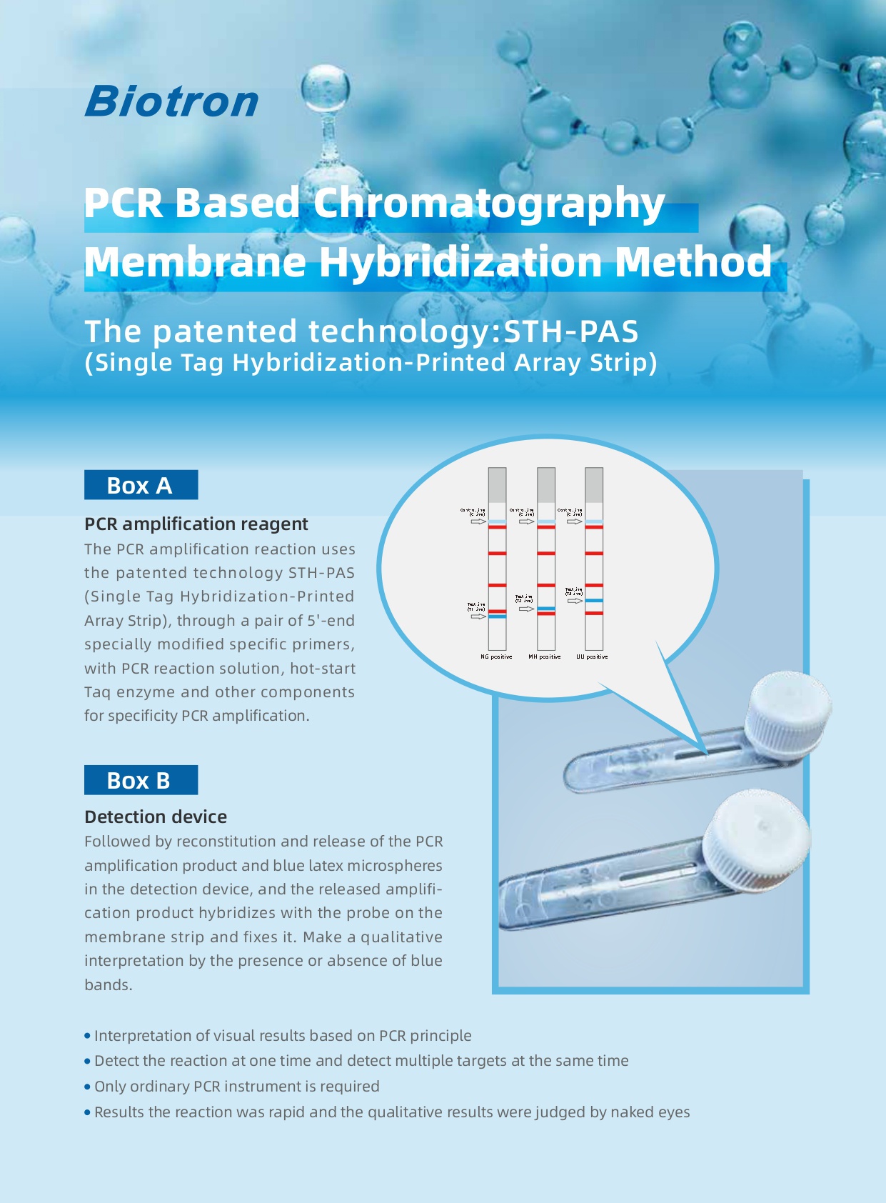 The PCR amplification reaction uses the patented technology STH-PAS (Single Tag Hybridization-Printed Array Strip),