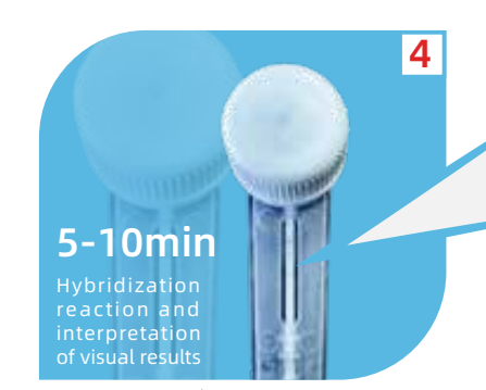 and the released amplification product hybridizes with the probe on the membrane strip and fixes it. Make a qualitative interpretation by the presence or absence of blue bands.